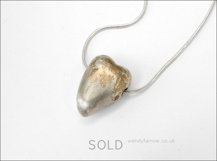 This hallmarked silver heart pendant is embelleshed with 22ct gold leaf. To protect the silver portion from tarnishing, it has been lightly coated, sealing in the leaf. The form is entirely hand crafted from start to finish, ensuring it is one of a kind.