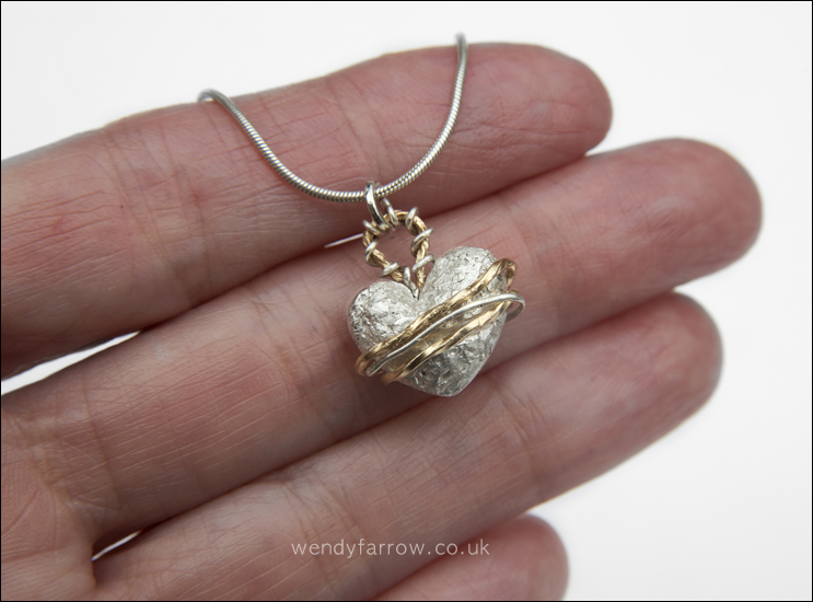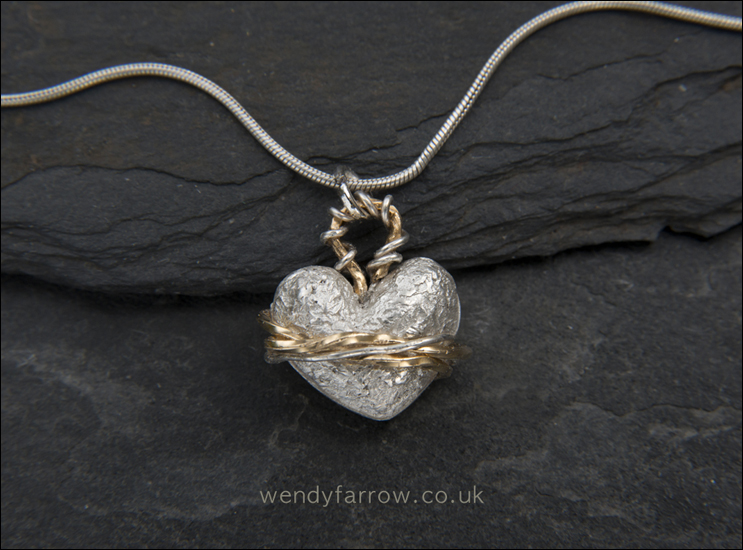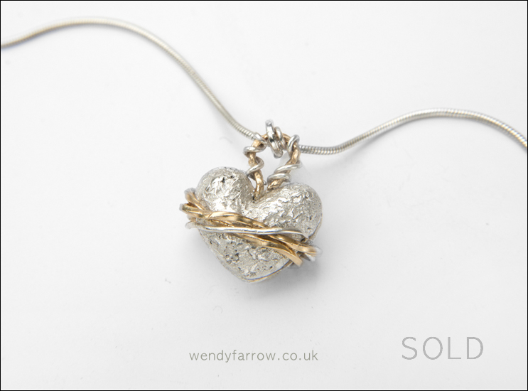 SOLD - This one-of-a-kind solid silver heart pendant with 14ct gold-filled wire and sterling silver wire was hand crafted in two parts, and bound through the chambers with an untarnishable thread. A light protective coating prevents further oxidisation and helps prevent scratches with normal wear. As this is under 7 grams, it is not hallmarked.